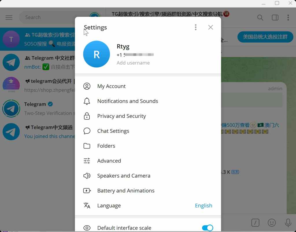 登录成功后,方便操作,下面将电报汉化成简体中文。
